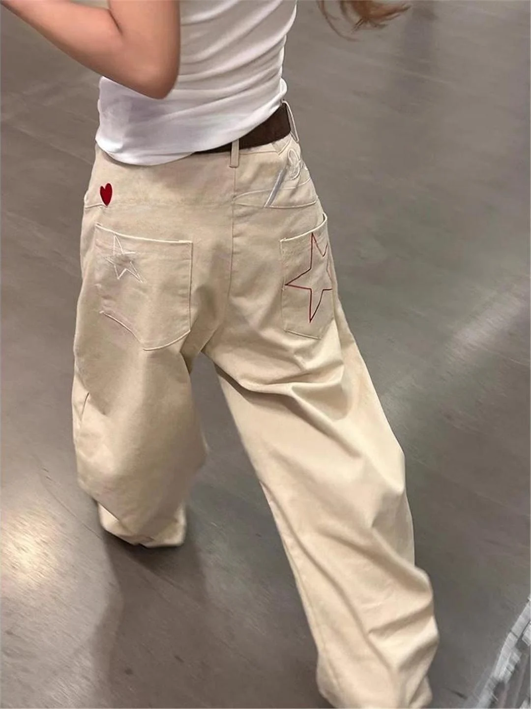레트로 아메리칸 스타 레터 자수 청바지 남녀 가을 하이 스트리트 스트레이트 루즈 와이드 레그 팬츠 코튼 데님 청바지