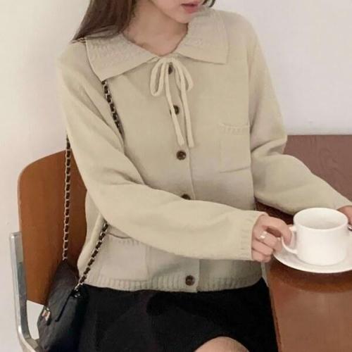 [옷자락]여성 심플 리본 넥 스트랩 버튼 니트 가디건
