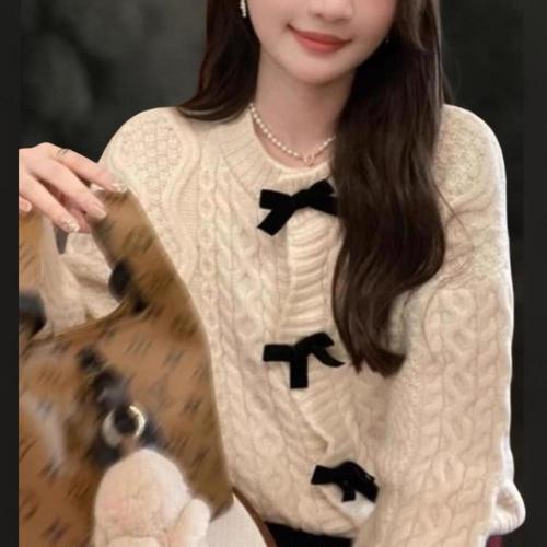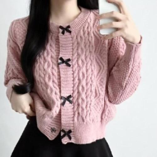 [신상오픈런]여성 꽈배기 트위스트 리본 포인트 니트 가디건