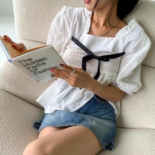 [브이와이][VY] 여자 펀칭 더블 스퀘어넥 반소매 리본 레이스 블라우스_14332909_588847