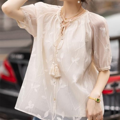 [샵앤]여성 펀칭 레이스 리본 여름 반팔 블라우스 MSE-WBL-20703-아이보리