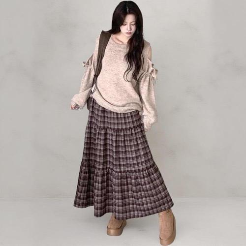 [옷자락] 여성 사랑스러운 어깨 트임 리본 장식 앙고라 니트