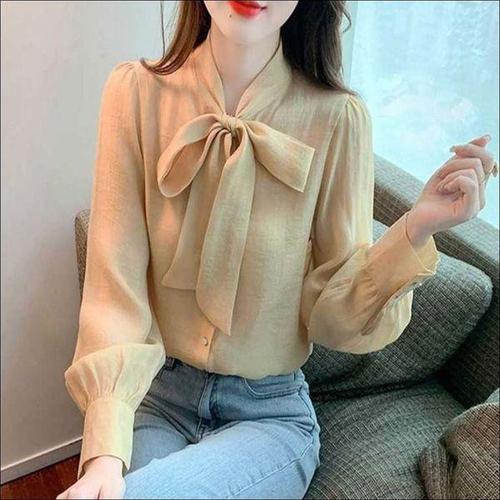 여성 새틴 타이 셔츠 가을 블라우스 봄 데일리룩 셔츠블라우스 오버핏 브이넥 리본