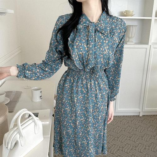 긴팔 원피스 꽃무늬 리본 프릴 플라워 봄 가을 쉬폰 WEE8EA9