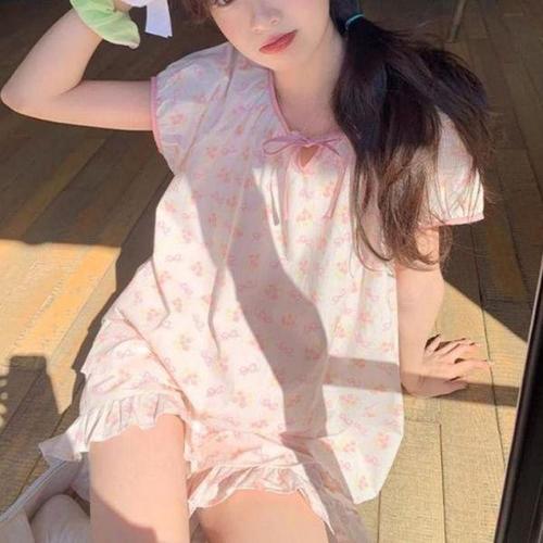 여름 지지미 반팔 원피스 여성 잠옷원피스 홈웨어 빅사이즈 이지웨어 리본 반팔