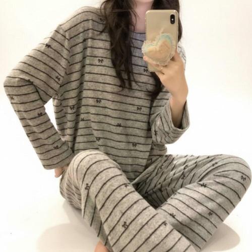 [미라클세븐]여성 루즈핏 라운드넥 기모 스트라이프 리본 잠옷 세트
