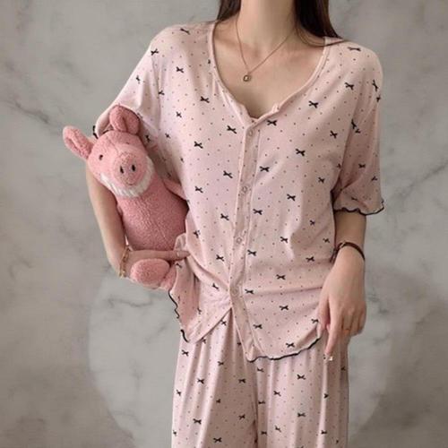 [옷자락] 여성 수면복 리본무늬 캡슬리브 반팔티 팬츠 잠옷 세트