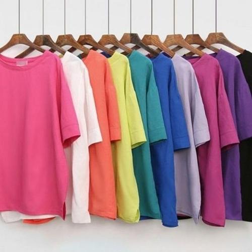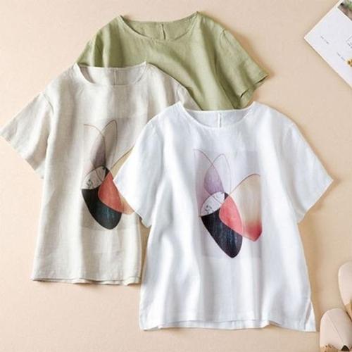 |KHT95BA|여성 단색 린넨 부드러운 핏 라운드넥 반팔 티셔츠