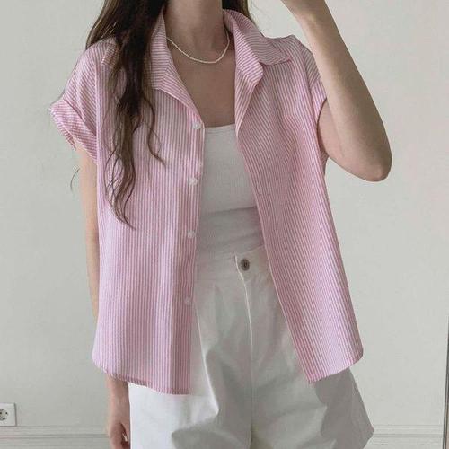 |KHT963E|여성용 파스텔 스트라이프 롤업 크롭 반팔 린넨 티셔츠