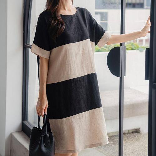 [드리다]여자 여름 배색 H라인 빅사이즈 린넨 원피스 40-50대 미시 중년여성 엄마옷 하객 출근 모임 선물
