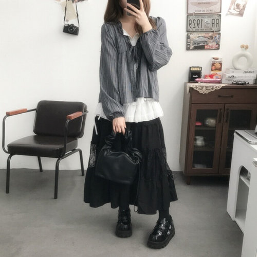 입꼬 / 소다 린넨 스트라이프 프릴 긴팔 블라우스3color