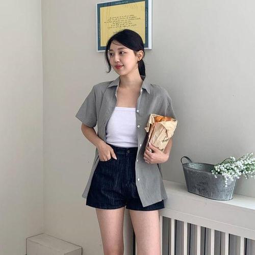 여성 캐주얼 린넨 루즈핏 반팔 크롭 카라 셔츠
