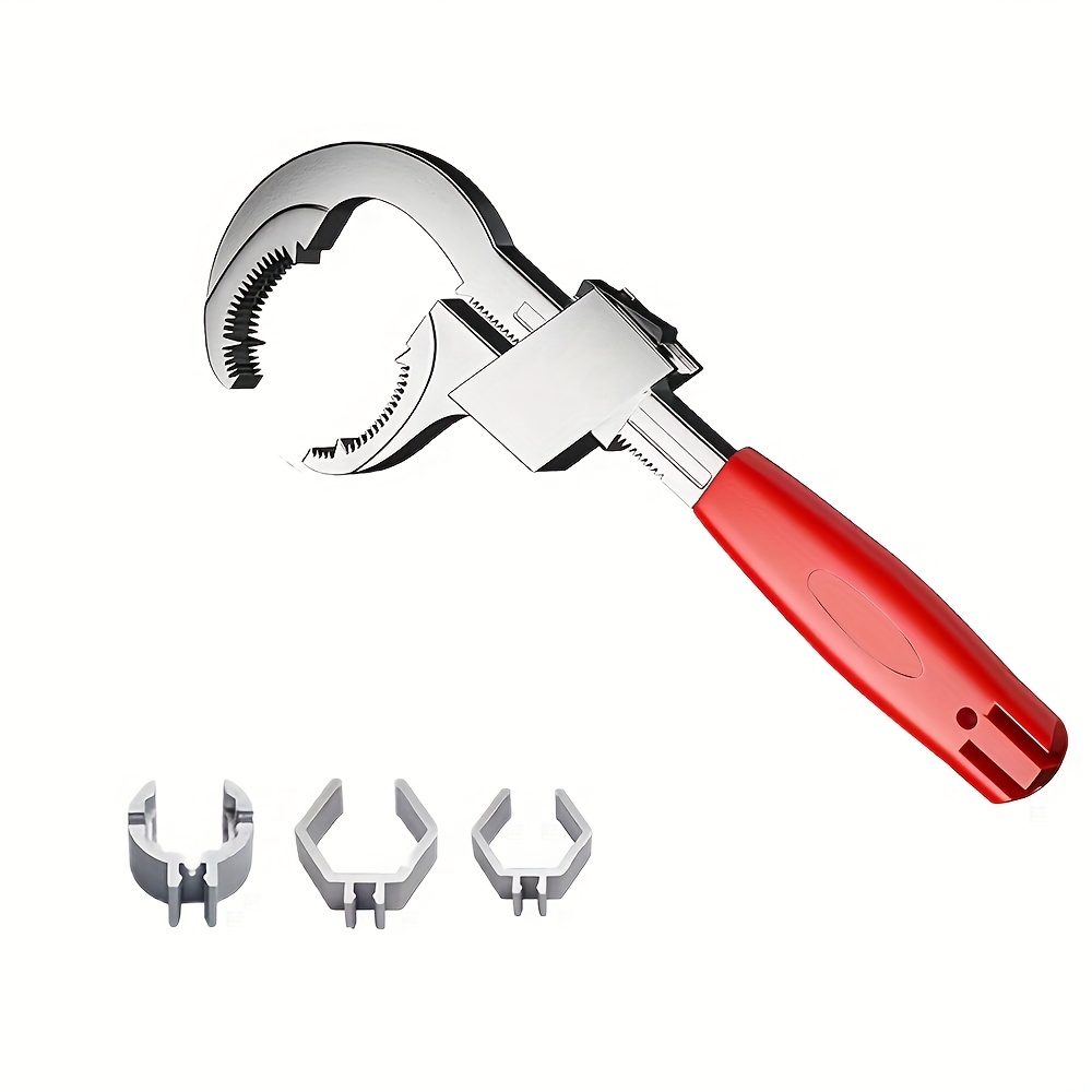 TEMU 다용도 욕실 렌치 세트 (조절 가능한 파이프 렌치 포함). 튼튼한 금속 구조와 빨간색 손잡이가 특징입니다. 세면대 설치 및 파이프 조정을 위한 3가지 크기의 슬롯이 포함되어 있으며, 욕실용 특수 렌치도 함께 제공됩니다.