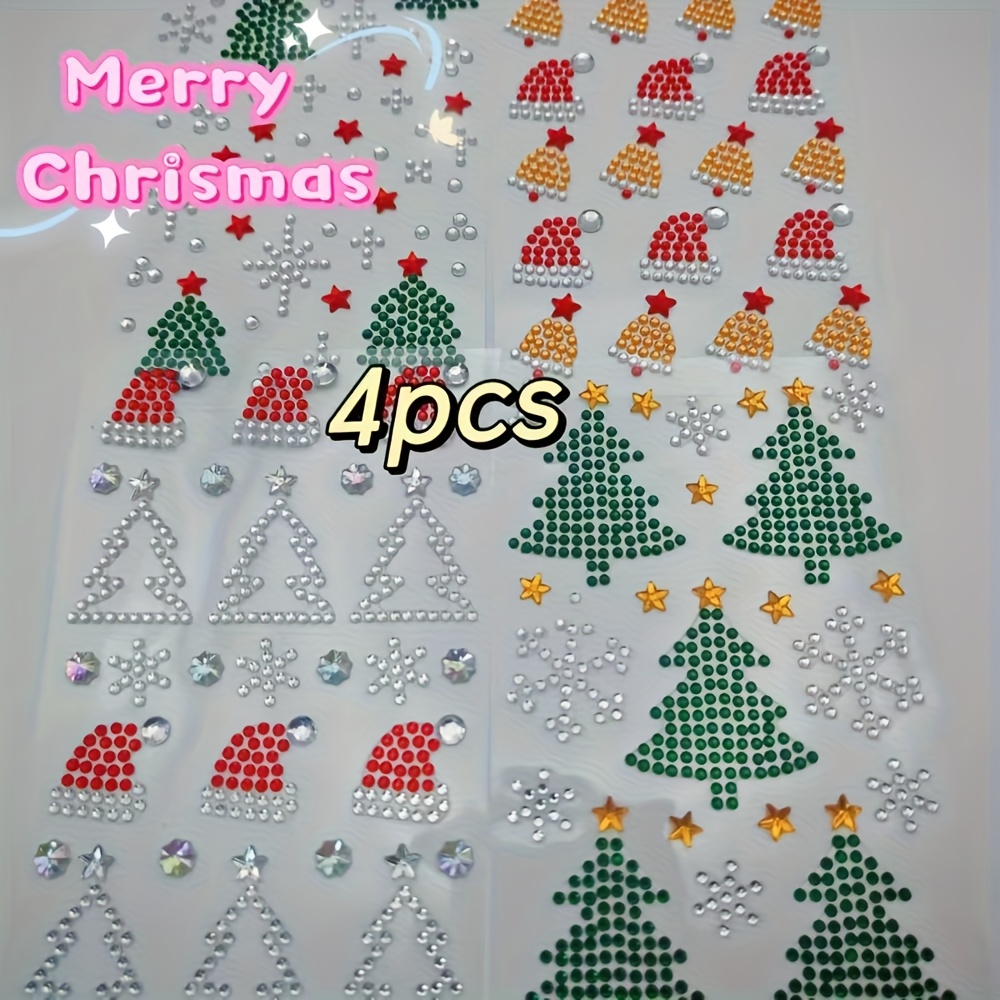 TEMU 4개입 자가 점착 라인스톤 스티커 - 광택 크리스마스 트리, 눈꽃, 별, 장식 장식 페이스 쥬얼리 파티 메이크업, 네일, 바디 장식용 - 겨울 휴일 크리스마스 장식, 크리스마스 장식에 적합