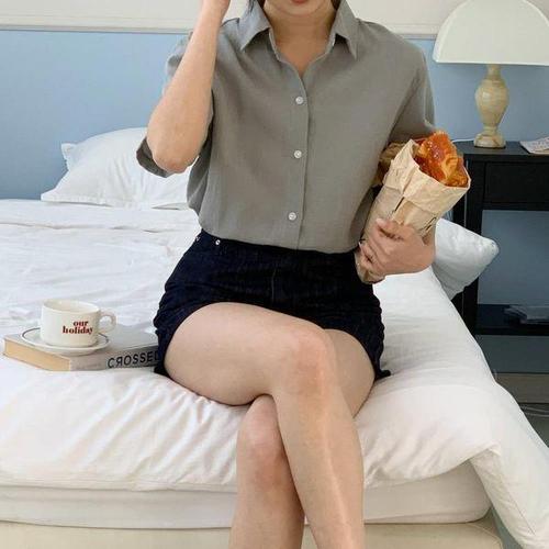 [다잇템]여성 반소매 마원단 베이직 코튼 셔츠