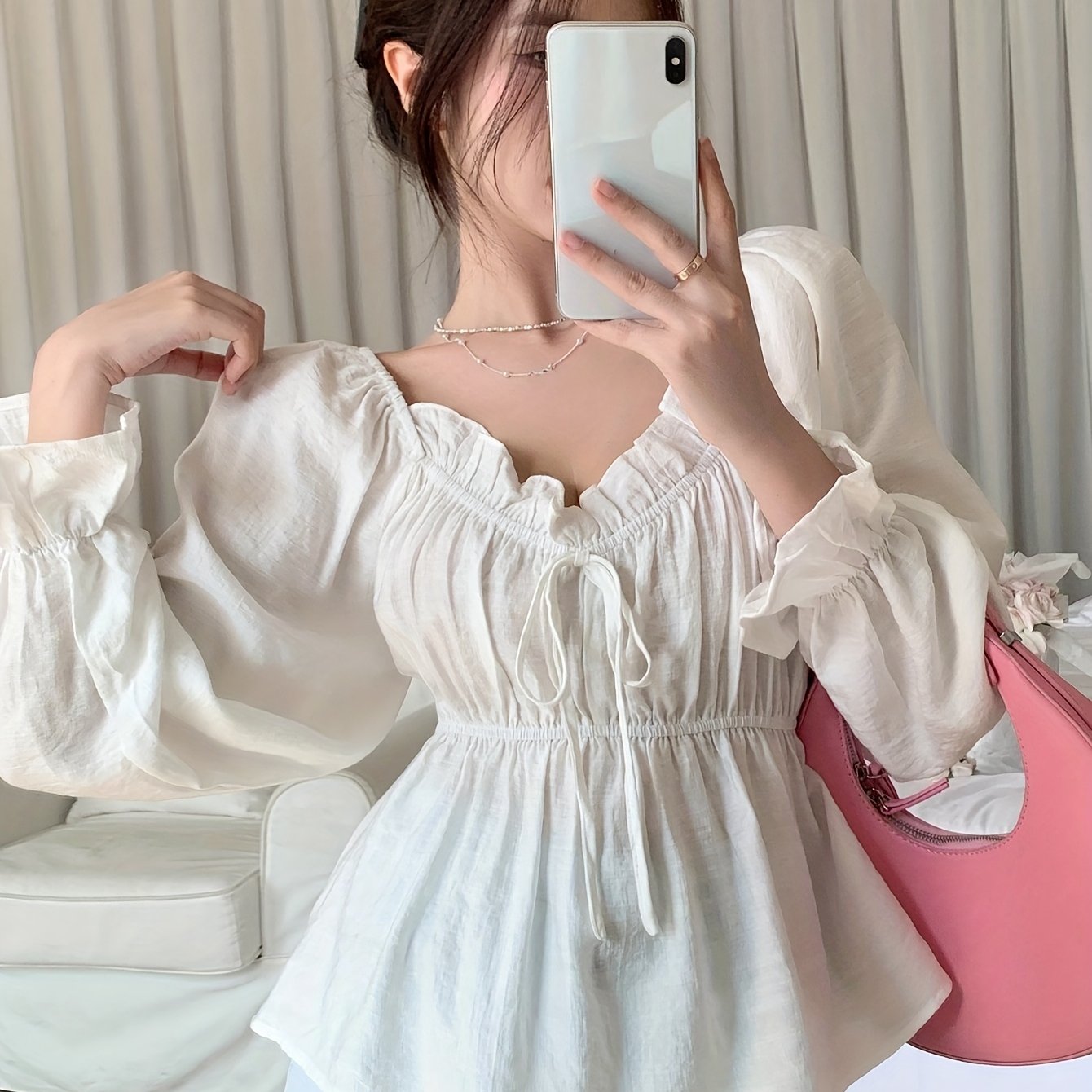 TEMU 우아한 캐주얼 단색 러플 오프숄더 긴팔 셔츠 | 허리 주름 디자인, 2-in-1 가을 여성 의류 스타일