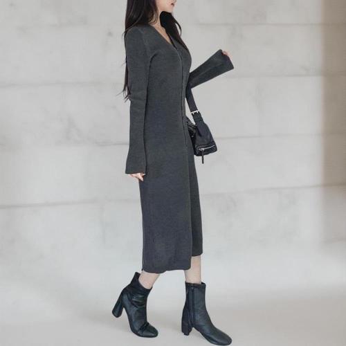 여성 단추 슬릿 슬림핏 롱 골지 V넥 드레스