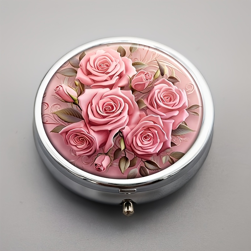 TEMU 데이 로즈 필 박스 - 우아한 핑크 플로럴 메탈릭 마감, 레이어드 구획이 있는 컴팩트 휴대용 약통, 여성/ 생일/기념일 선물, 식품 안전 & 무취, 귀여운 약 케이스, 일상 약 보관, 고급 소재, 롬틱 감성, 내구성 강함, 스타일리시 정리함, 를 위한 기념품