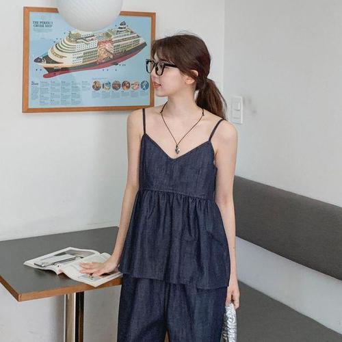 [다잇템_패션]여자 진 면원단 어깨끈 키치무드 티어드 나시티