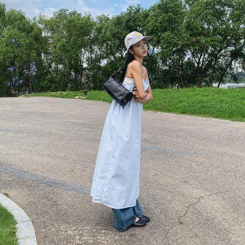 [신상오픈런]여성 코튼 A라인 어깨끈 데님 롱 나시 드레스
