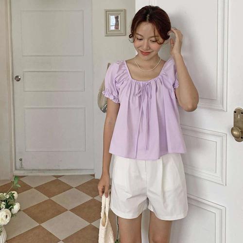 |KHH3FBD|여성용 코튼 기본 퍼프 소매 밴딩 반팔 숏 블라우스