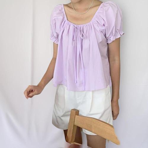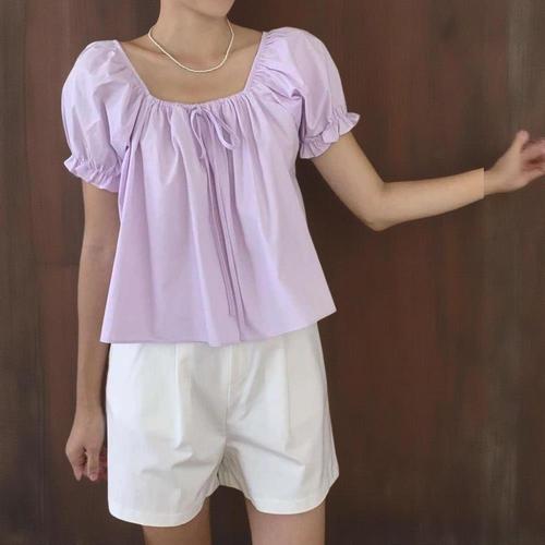 |KHH3F34|여성 반팔 블라우스 스퀘어넥 트임 코튼 플레어 셔링 상의