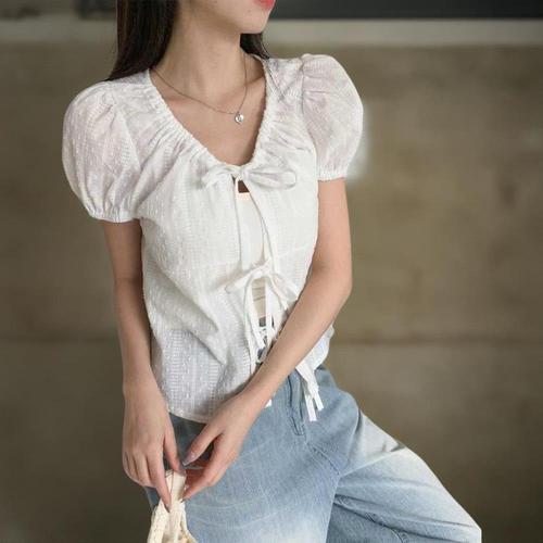 |KHH3EEF|여성용 코튼 프릴 레이스 퍼프 소매 반팔 블라우스