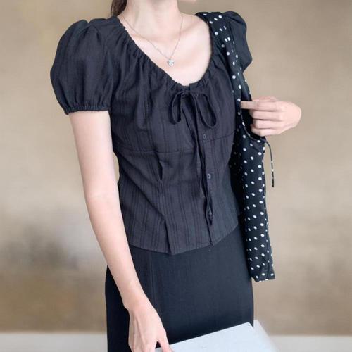 |KMH3EAE|여성 퍼프소매 면 블라우스 단추 포인트 셔링 반팔 티셔츠