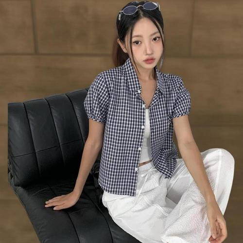 |KMH3F55|여성용 코튼 체크 벌룬 소매 반팔 블라우스