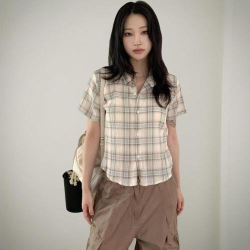 |KMH3F4C|여성 클래식 체크 쿨링 반팔 셔츠 면 스판 블라우스