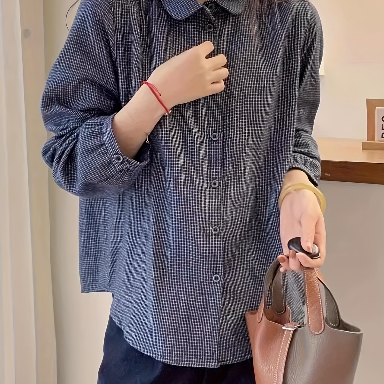 TEMU 체크무늬 버튼 프론트 셔츠, 캐주얼 롱 슬리브 터너오버 셔츠, 여성 의류