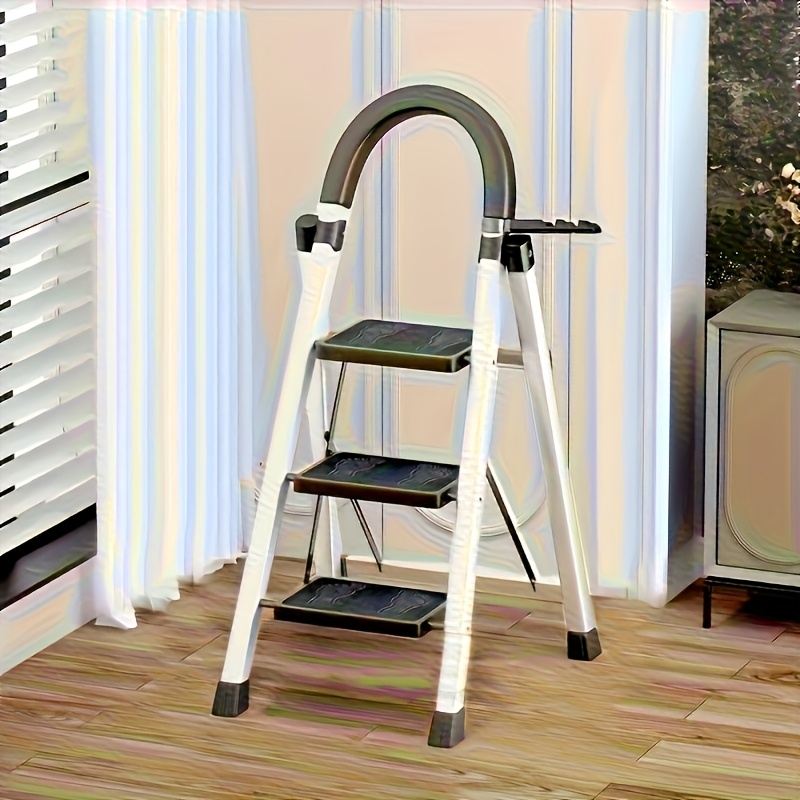 TEMU 1개 강화형 3단 접이식 사다리 (손잡이 포함) - 휴대용 금속 및 플라스틱 스텝 스툴, 튼튼한 미끄럼 방지 그립 계단 & 넓은 베이스로 실내 가정 수리, 차고, 주방, 욕실에 적합 - 모던 디자인 접근성 사다리, 가볍고 트렌디한 내구성 구조, 차고에서 공간 절약형 보관, 아파트 사용자들의 최고의 선택