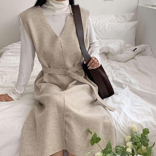 여성용 봄 미디 모직 브이넥 민소매 조끼 베스트 원피스