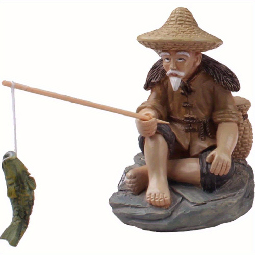 TEMU 중국 어부 조각상 피규어 - 핸드페인팅 느낌 레진 미니어처 조각, 전통 아시아 스타일 낚싯대와 물고기, 실내외 장식용 가정, 정원, 사무실 - 생동감 넘치는 미니 화분 장식