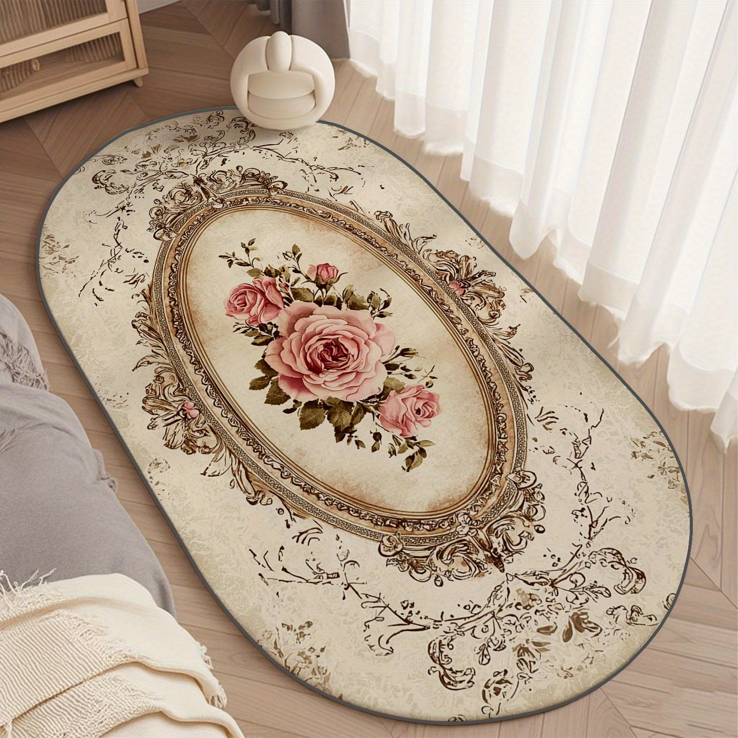 TEMU 1개 유럽 클래식 스타일 오벌 지역 매트 - 꽃무늬 장미 & 화려한 테두리 디자인, 모조 캐시미어 & TPR 소재, 미끄럼 방지 세탁 가능 거실 침실 홈 데코, 내구성 있는 실내용 바닥 커버