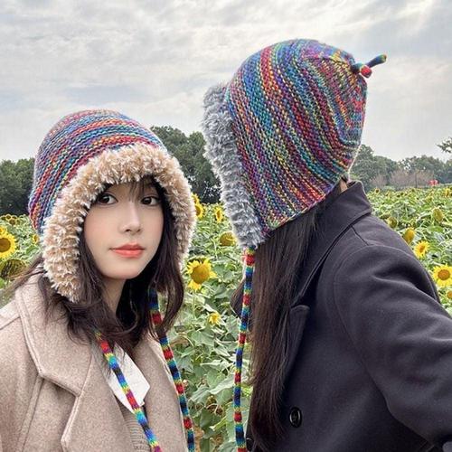 여성 니트모자 퍼 귀달이모자 겨울 무지개 털모자 벙거지모자 WFK2GDT