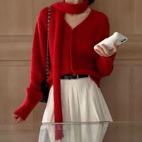 [신상오픈런]여성 브이넥 크롭 니트 가디건 무지컬러 머플러