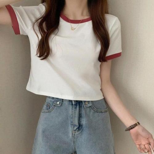 [오너클랜]인기상품 라운드 소매 배색포인트 무지 크롭 캐주얼 반팔티셔츠 [WF55838_250919]