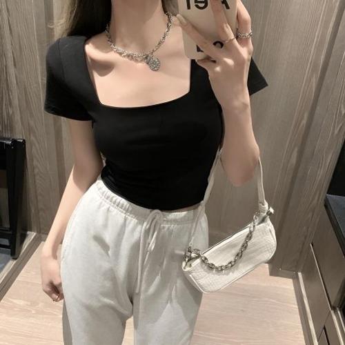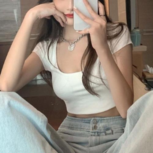 [엄지척]여성 슬림핏 스퀘어넥 무지 크롭 반팔 티셔츠_19609788_667501