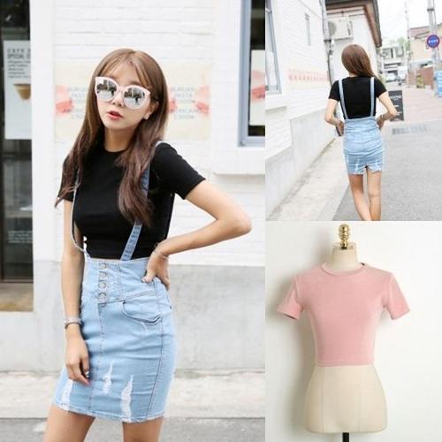 [옷자락]여자 라운드넥 단추 스판 크롭 쫄티 무지 티셔츠