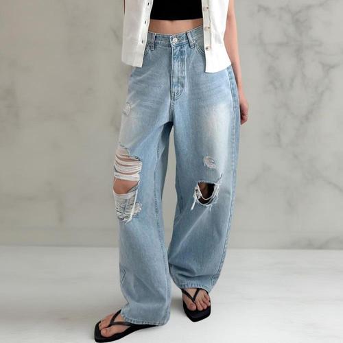 [신상오픈런]여성 연청 와이드핏 워싱 찢청 무파진 빈티지 청바지