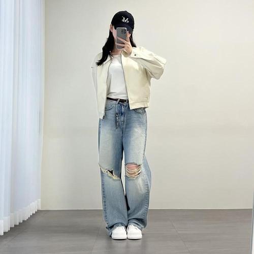 [옷자락] 여자 연청 와이드핏 워싱 찢청 무파진 구제 청바지