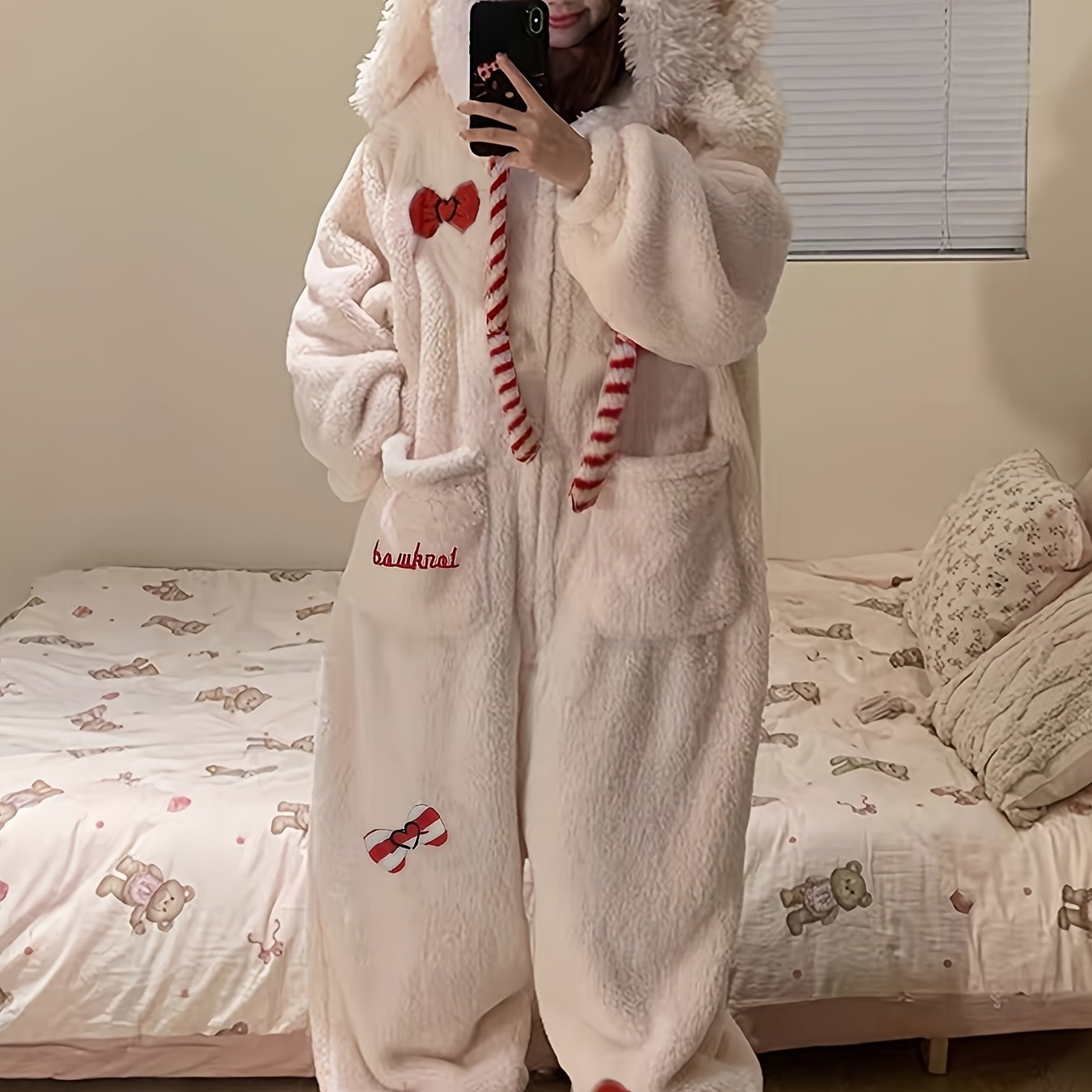 TEMU 귀여운 리본 후드 원피스 파자마, 긴 소매 지퍼업 코스프레 파티 잠옷 - 두꺼운 플리스로 따뜻한 착용감, 카니발 할로윈 뮤직 페스티벌 코스튬 볼에 적합