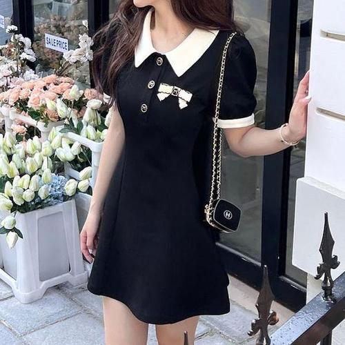 여자 블랙 리본브로치 배색 카라 반팔 미니 원피스
