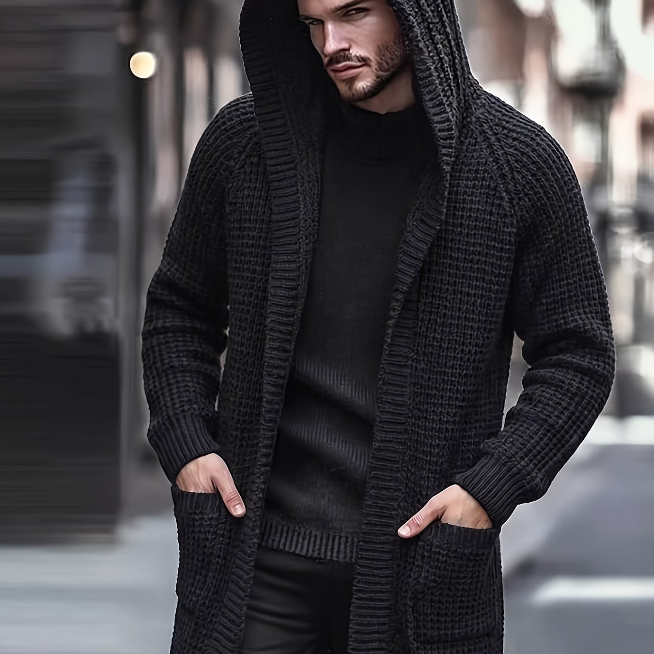 TEMU 남성용 캐주얼 스포츠 스웨터, 니트 가디건, 긴 후드 니트 가디건. 후드 디자인은 캐주얼하고 손쉬운 스타일을 더해주며, 긴 기장은 체형을 돋보이게 합니다. 가을과 겨울에 따뜻함과 패션을 제공하는 심플하면서도 스타일리시한 아이템입니다