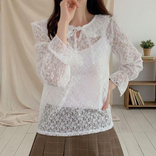 [다잇템]여성 프릴넥 블라우스 리본 크로쉐 꽃무늬 봄