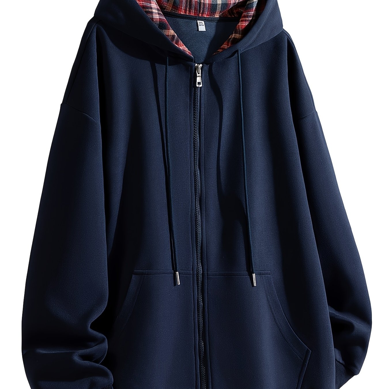 TEMU 남성용 캐주얼 체크 무늬 후드 가디건 스웨트셔츠 - 조절 가능한 드로스트링 긴소매 탑, 지퍼 디자인