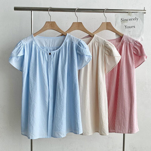 미즈큐즈 / 시원 썸머 지지미 스트라이프 튤립 날개 소매 블라우