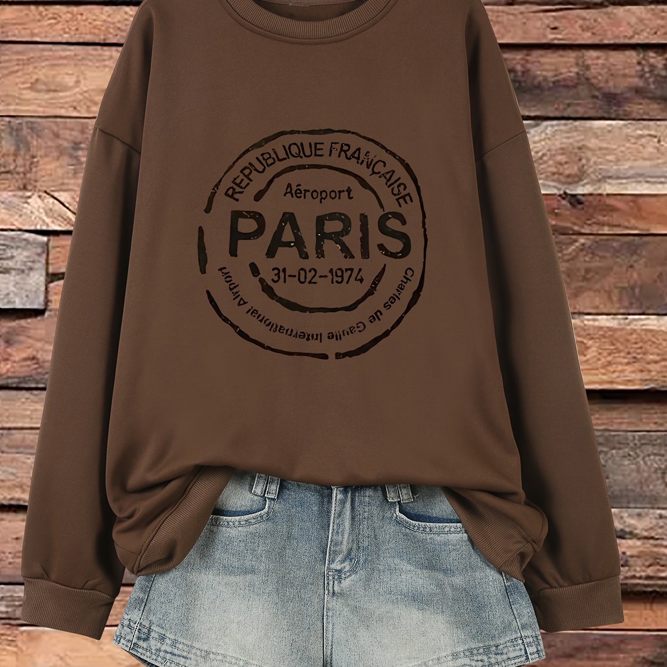 TEMU 여성용 플러스 사이즈 캐주얼 파리 빈티지 스탬프 그래픽 프린트 스웨트셔츠 - 갈색 라운드 넥 풀오버, 세탁기 사용 가능 사계절 편안한 착용감, 여행 영감 의류, 릴랙스 핏