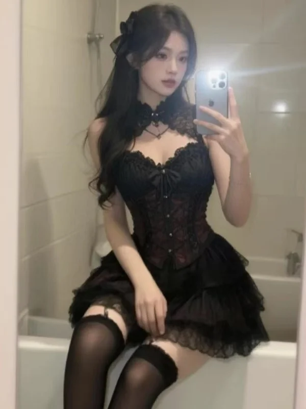 TEMU 여성용 프렌치 스타일 우아한 블랙 레이스 서스펜더 드레스 - 힙 허깅 롱 스커트, 세탁기 사용 가능한 정장 웨딩 파티 드레스, 사계절 착용